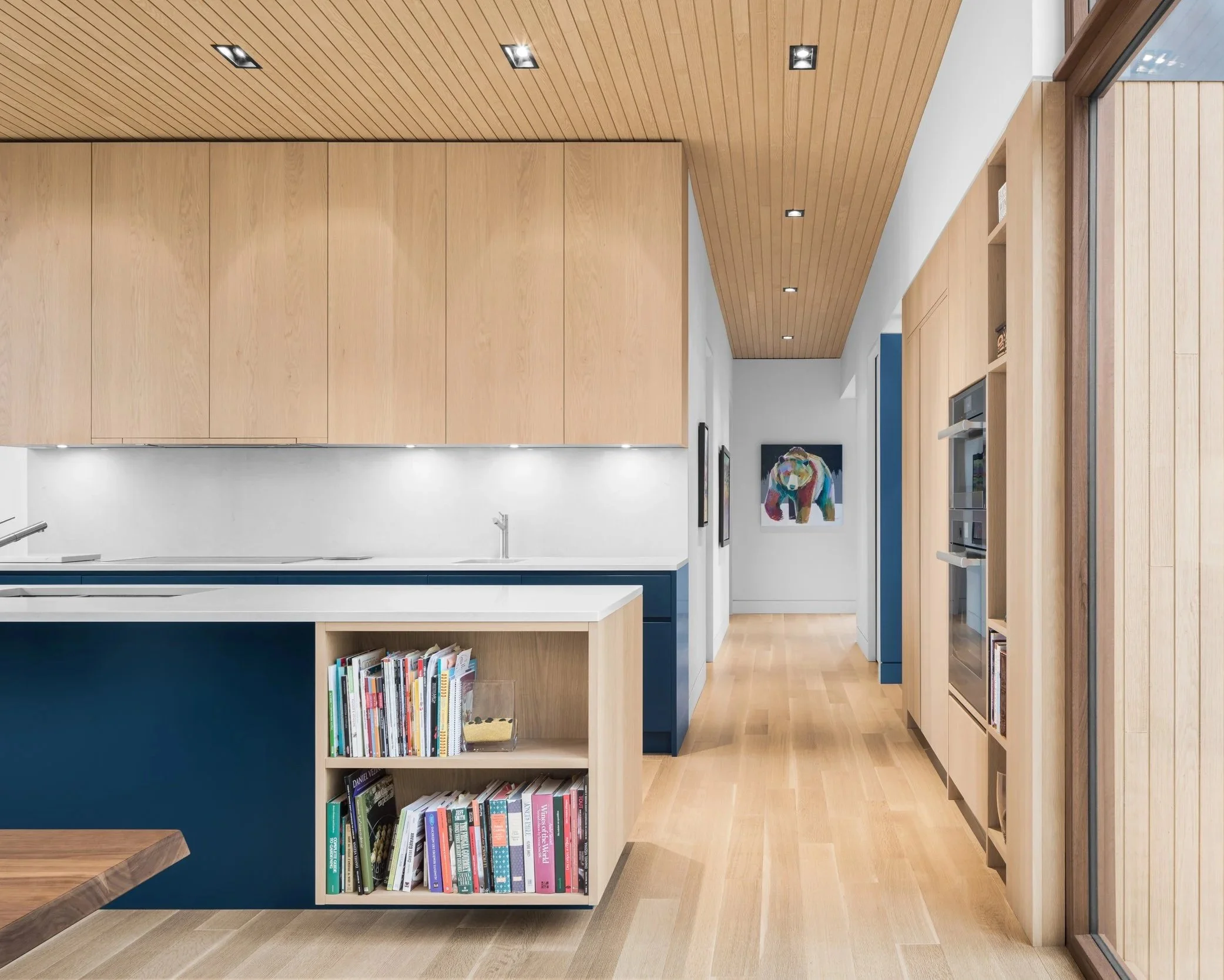 Armoires en placage de chêne teint, îlot en placage de chêne teint noir et acier et poignées encastrées en métal teint noir.