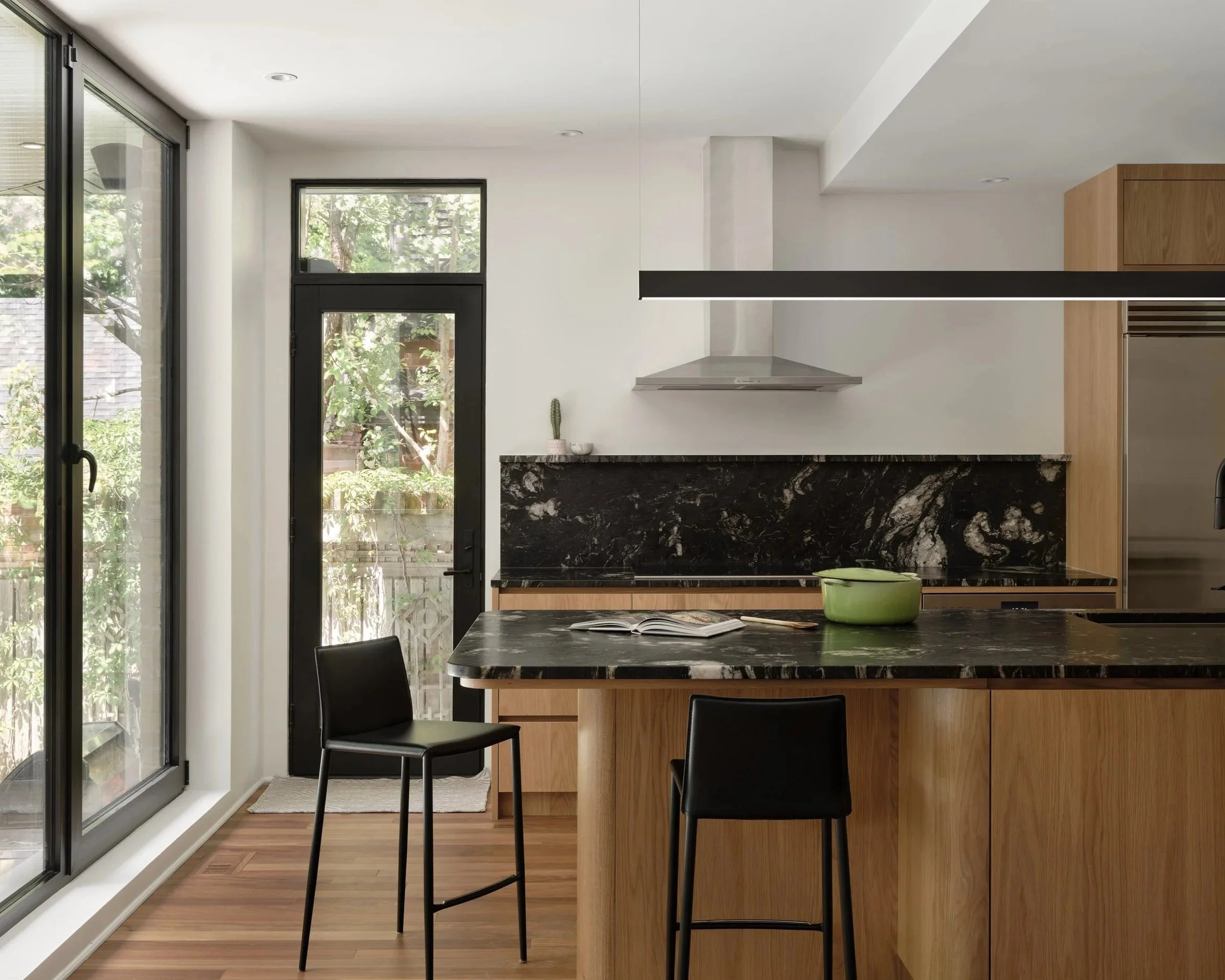 La cuisine, cœur de la demeure, a été repensée avec une attention méticuleuse. La teinture des éléments, en harmonie avec les planchers d'origine, crée une continuité visuelle. Les armoires flottantes, illusion parfaite grâce à une structure dissimulée, apportent une légèreté moderne. L'îlot central, alliance de chêne teint noir et d'acier, devient le point de convergence, assurant une transition fluide vers la cour arrière.