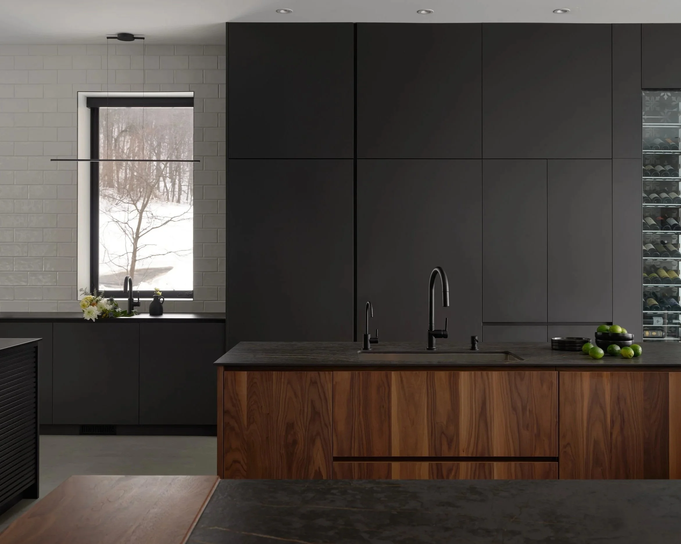 Cette cuisine unique est au cœur d’une maison unifamiliale spectaculaire nouvellement construite par la firme d’architecte Garnier Villeneuve. Le point focal de cette demeure est l’espace cuisine, situé au centre de la maison, conçu dans une volumétrie sur deux étages de façon à créer une zone distincte avec les pièces en périphéries. La cuisine a été imaginée en deux aires fonctionnelles complètement indépendantes.