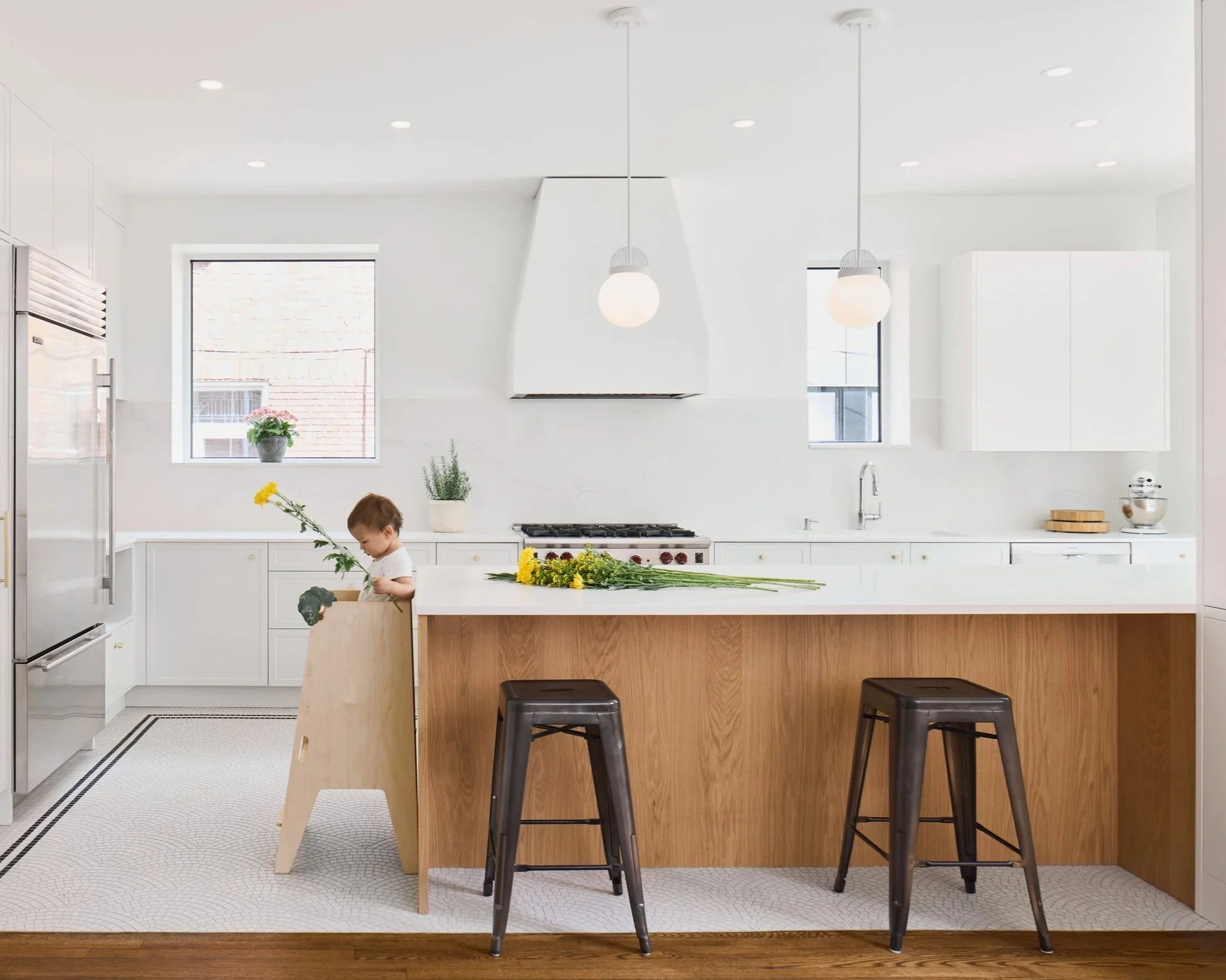 Cette cuisine est conçue pour être à la fois fonctionnelle et agréable à vivre dans une pièce ouverte vers la salle à manger. L’îlot central bleu crée un point focal qui apporte une atmosphère à la fois apaisante et dynamique, favorisant les moments de convivialité. Ce choix de couleur ajoute du caractère à l’espace.